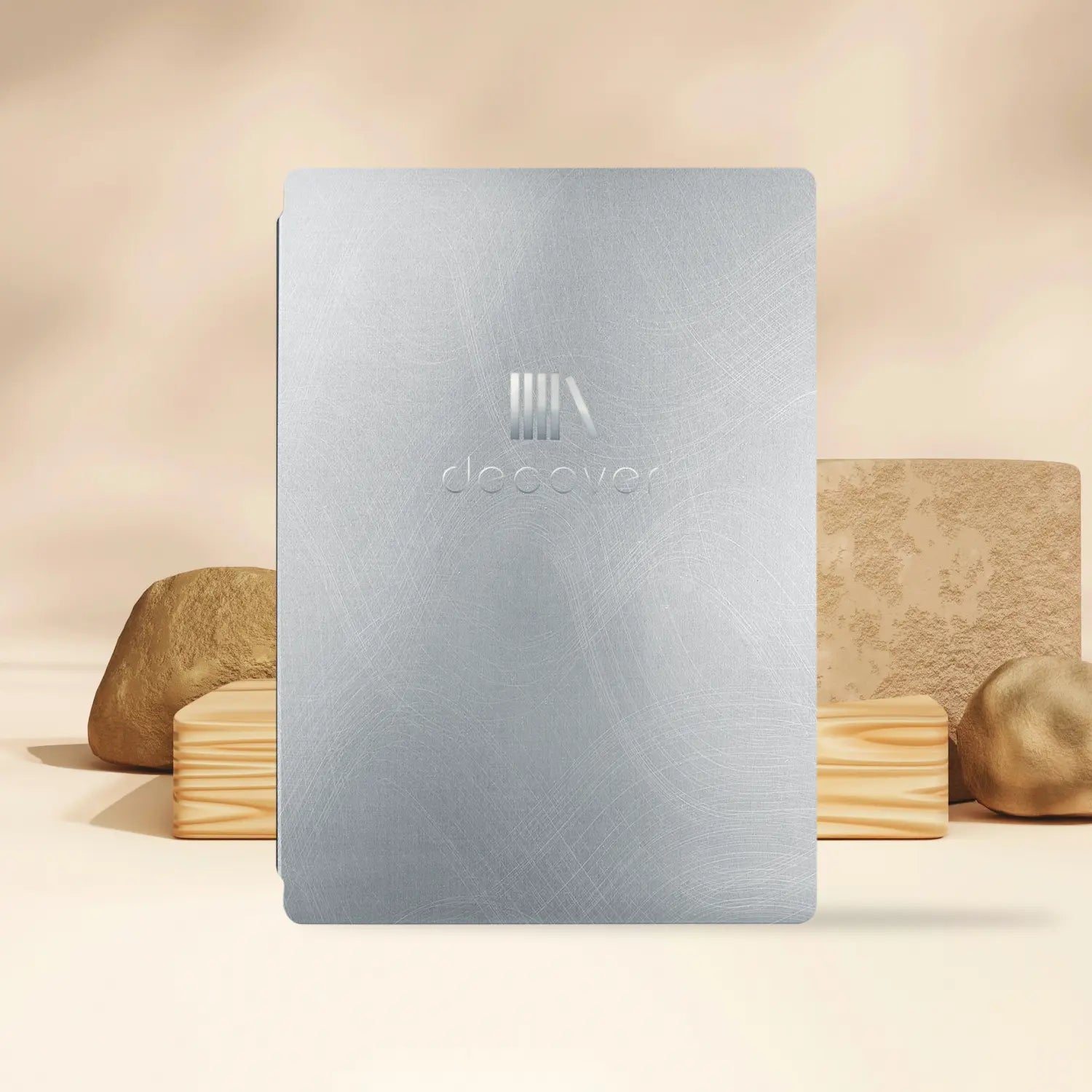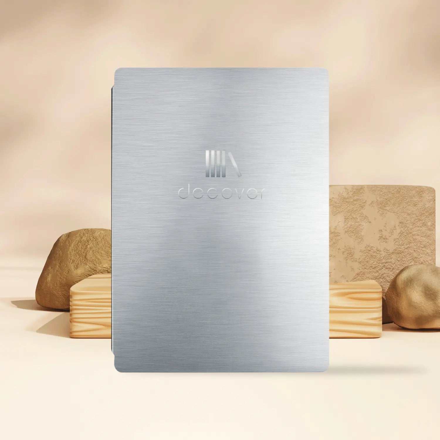 Een trendy menukaart voor A5 formaat, met roestvrijstalen uitstraling en elastiekverbinding voor een strakke look. Glad metaal is onbehandeld, geschuurd metaal is opgeruwd.