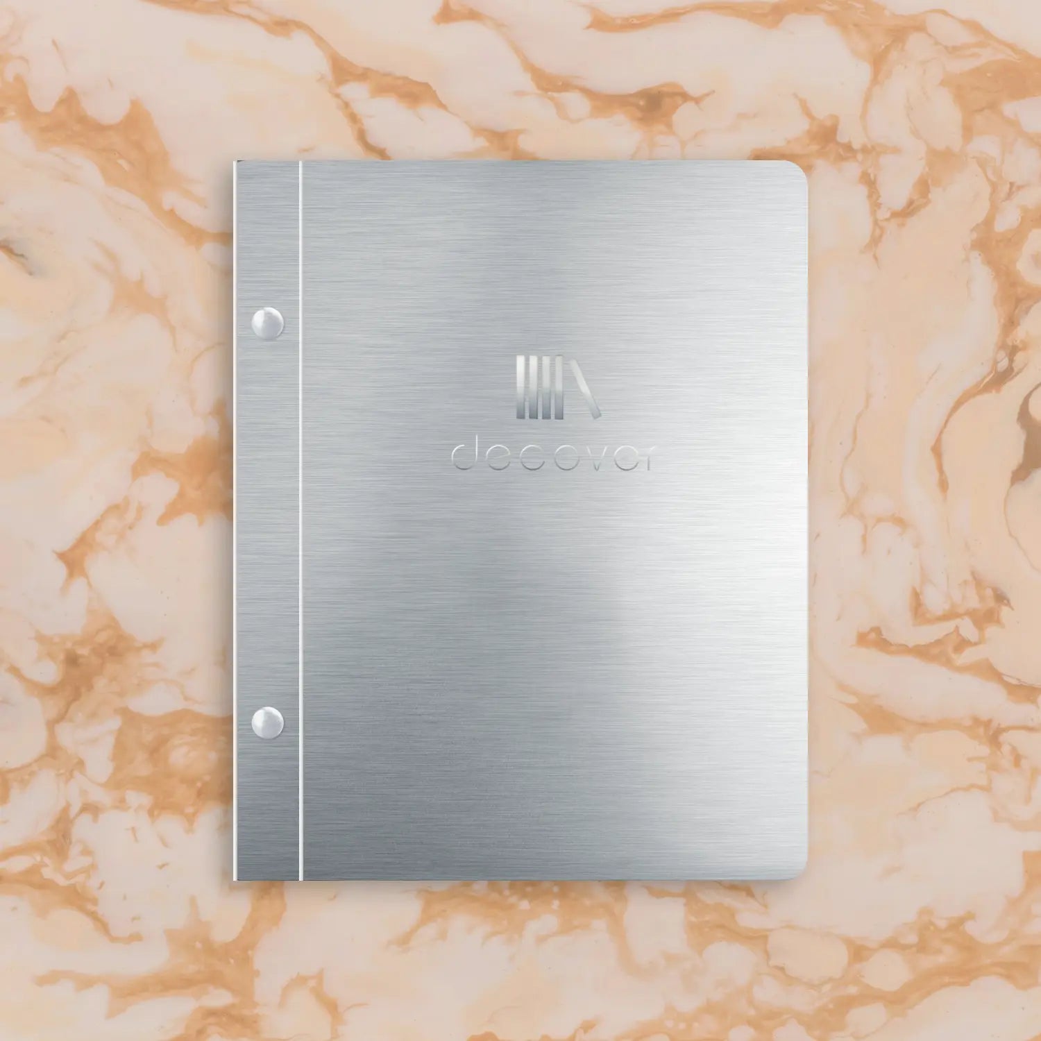 De metalen menukaart met boekschroeven in dezelfde kleur. Een tijdloze knaller in...